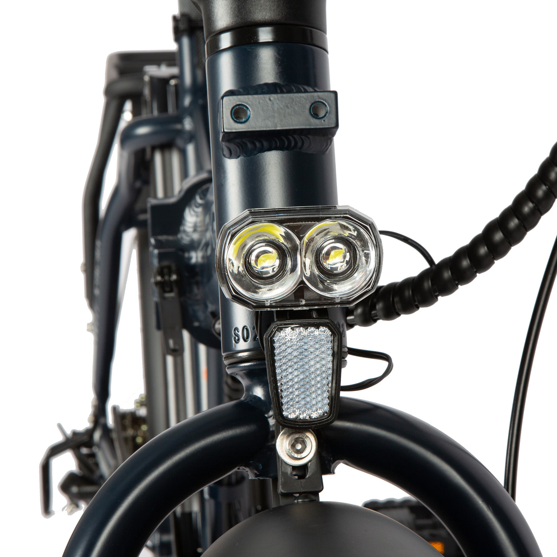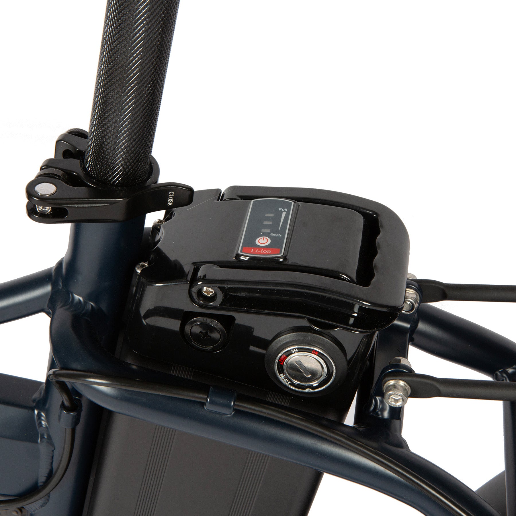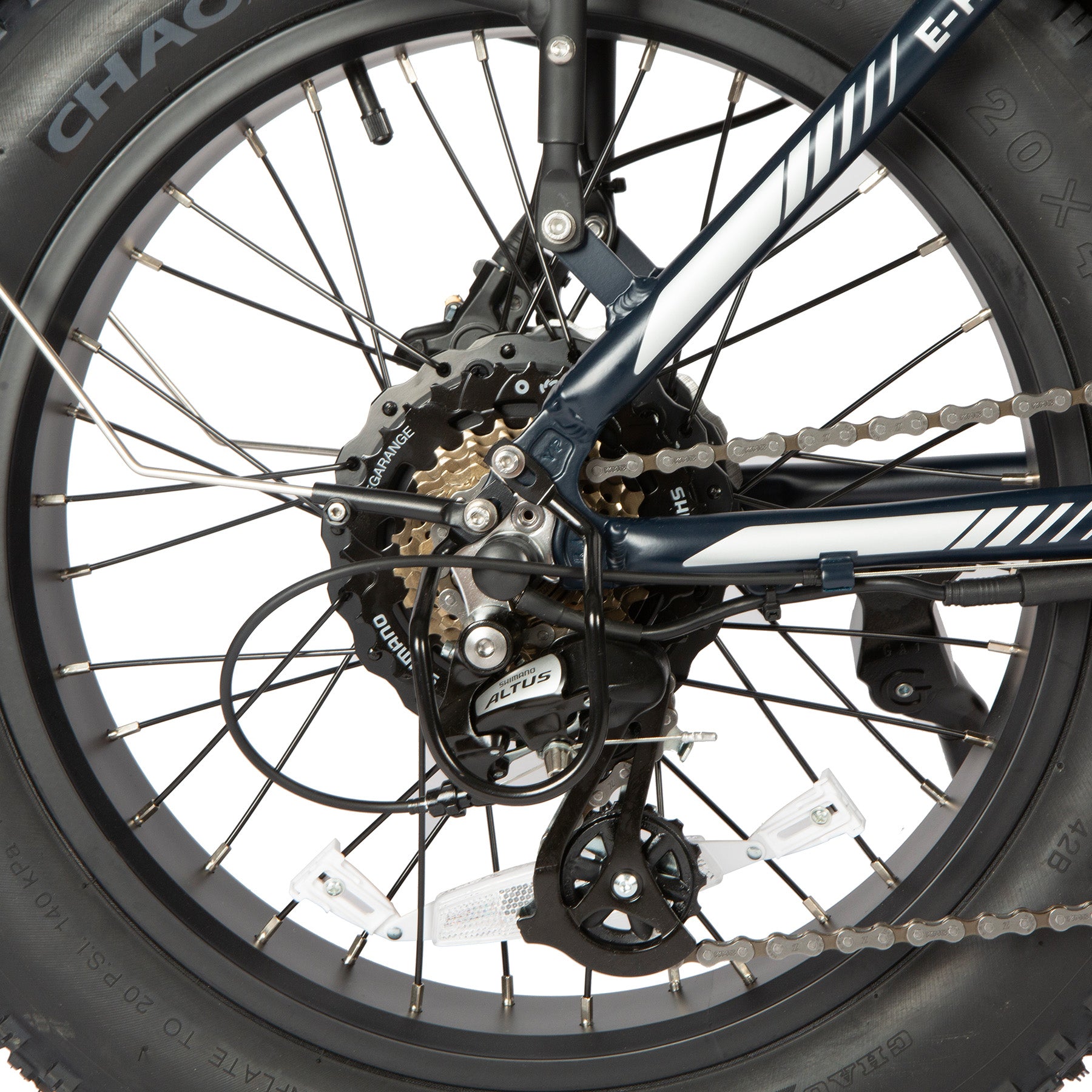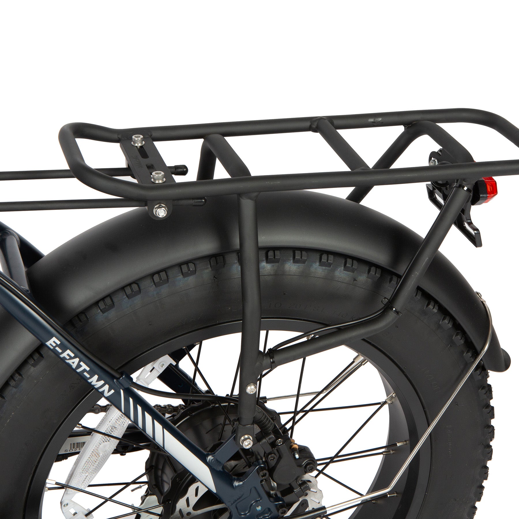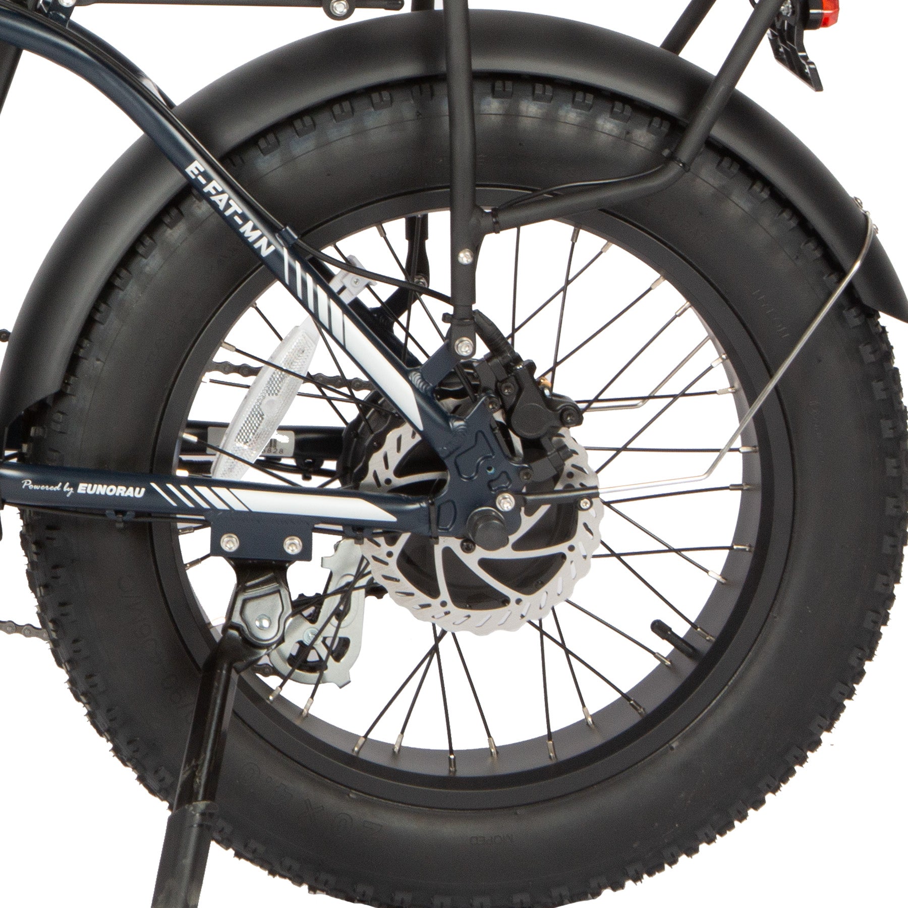 The E-FAT-MN in striking Midnight Blue blends rugged performance with urban portability. Featuring 20β x 4.0β fat tires and a foldable frame, this e-bike is perfect for compact storage, last-mile commuting, and off-road fun.